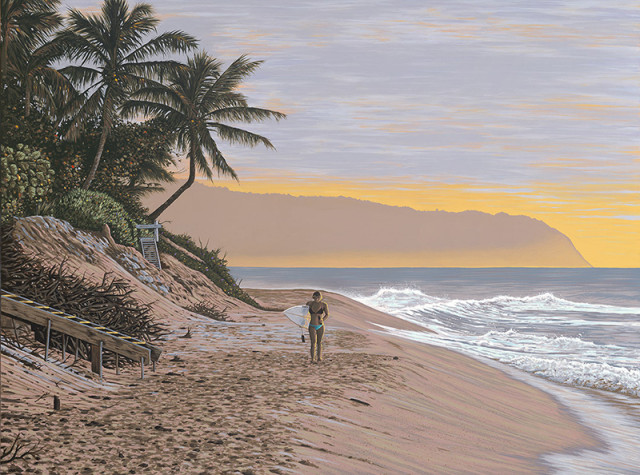 A surfer walks along Sunset Beach on the North Shore of Oahu, Hawaii